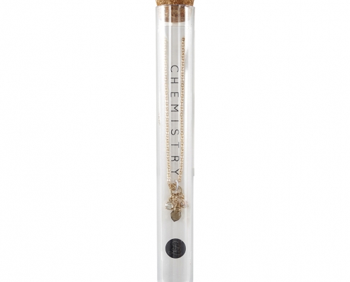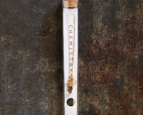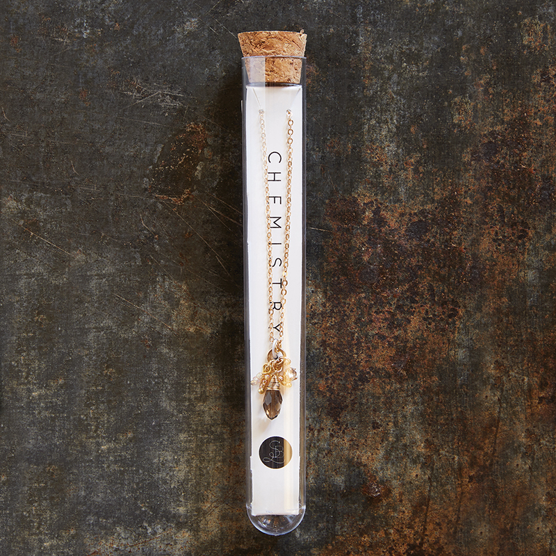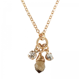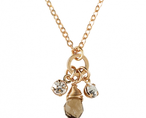 Hand wrapped beads and cut glass crystal gem stones adorn a gold chain