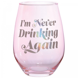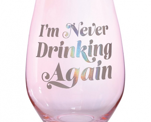 • Pink tinted glass with “I’m Never Drinking Again” in silver lettering