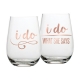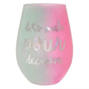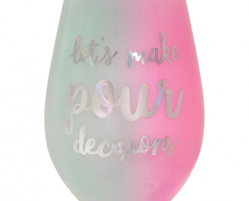 • Pink and blue glass with “Let’s Make Pour Decisions” in silver lettering
